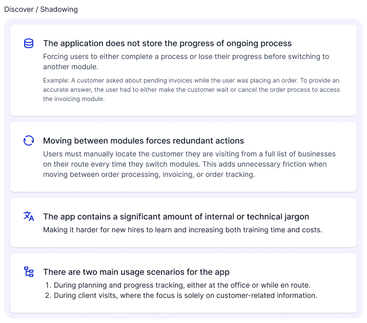 Supported by the local IT team, we shadowed three members of the sales team during a regular workday. With minimal intervention—only asking questions when we sensed frustration—we aimed to uncover pain points in the current application and understand how these issues affected the quality of service they provided to customers.