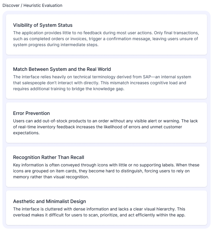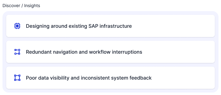 One of the most critical constraints uncovered during stakeholder interviews was the need to preserve the existing SAP-based back-end. To avoid major disruptions and reduce development time, the new application had to integrate seamlessly with the current infrastructure—limiting how much we could alter the underlying architecture.