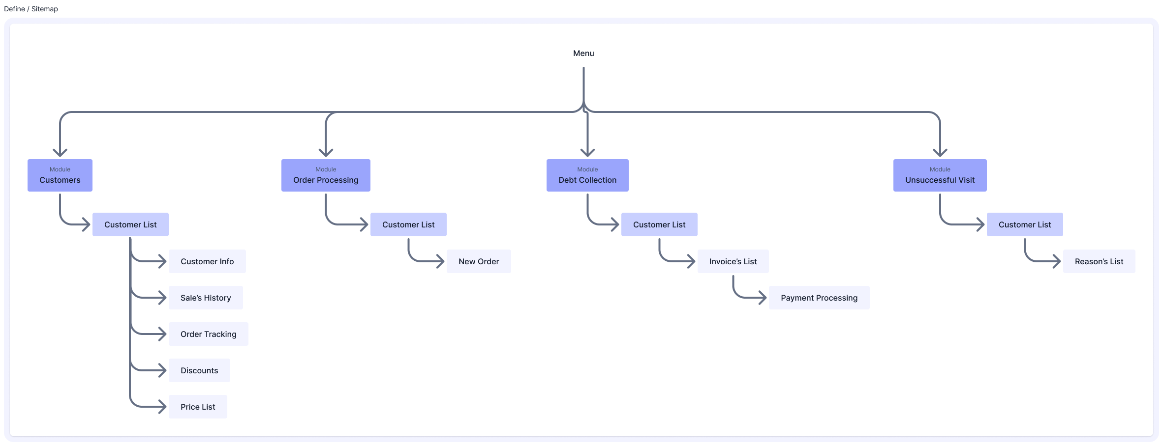 To address the workflow and navigation issues, I redesigned the app’s information architecture based on the two primary usage contexts identified earlier—planning/tracking and customer-facing interactions. The goal was to consolidate related features into unified flows, reducing the need to jump between modules. Key changes included: